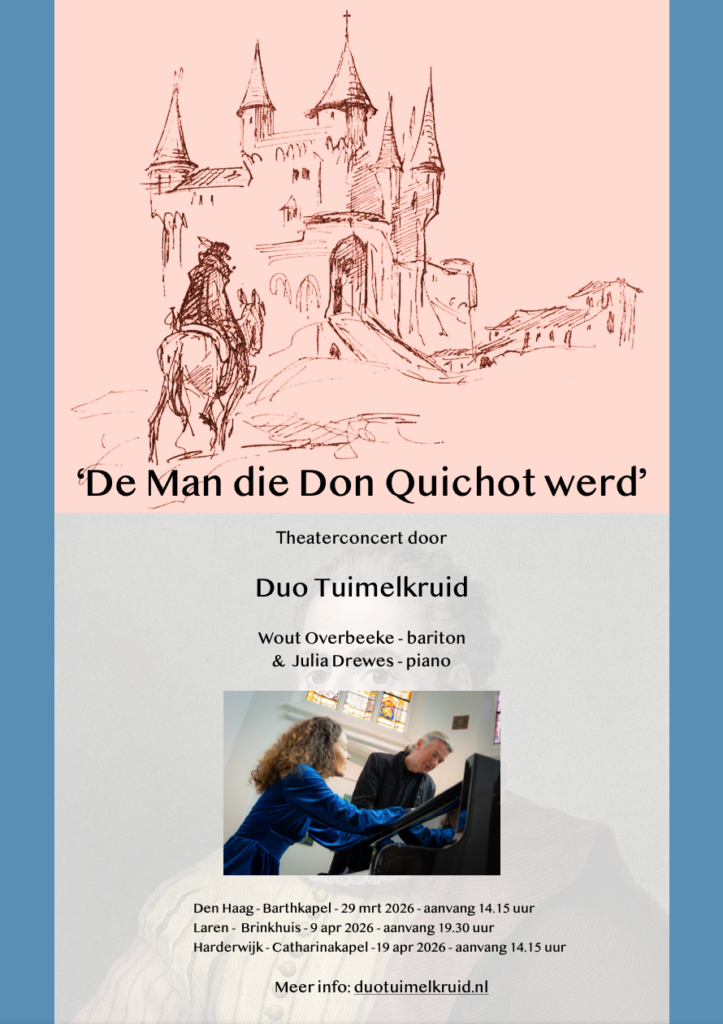 Theaterconcert over het leven van de schrijver van Don Quichot: Miguel Cervantes. Met liederen en pianostukken van o.a. Ravel, Ibert, De Falla, Mompou, Granados en Debussy.